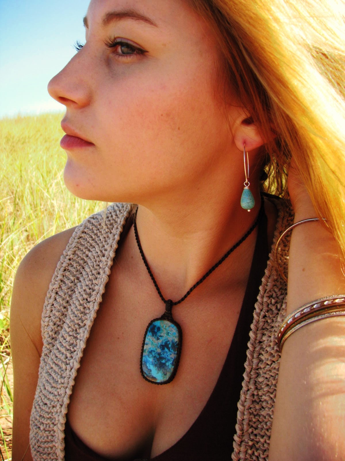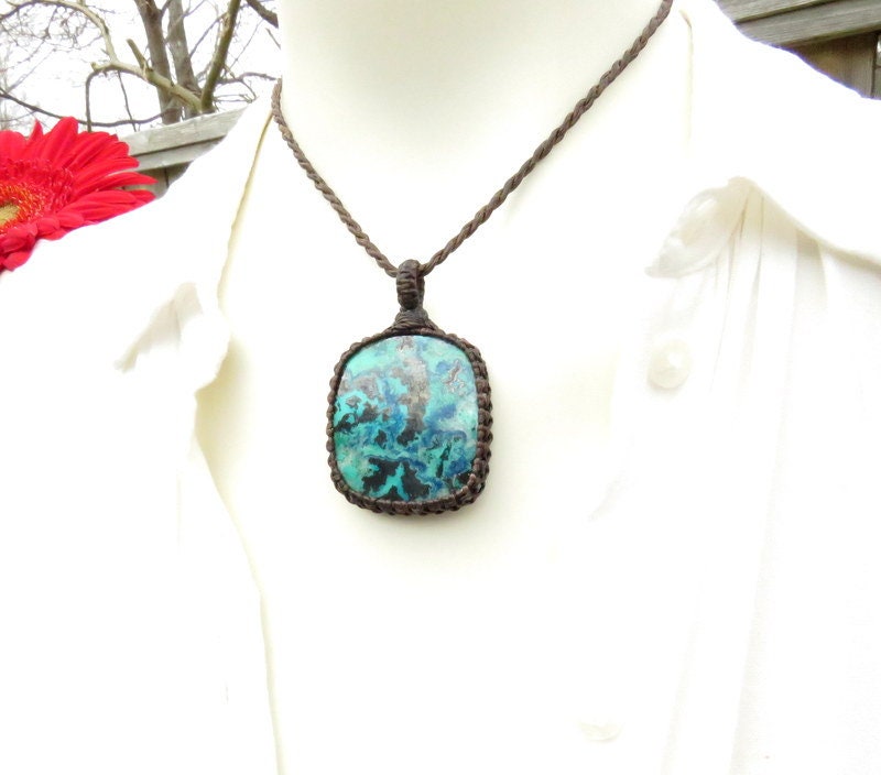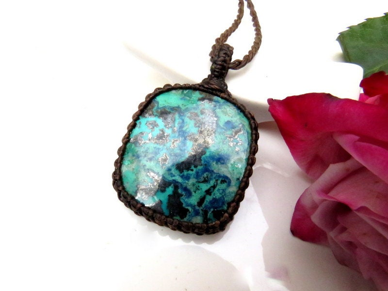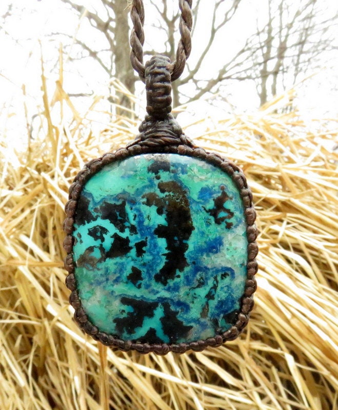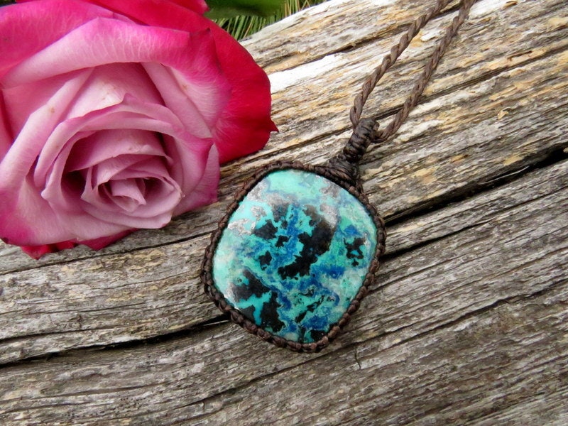 Quality Azurite macrame necklace - pretty azure blue & green Azurite with dark metallic areas - inclusions of Shattucktite and Chrysocolla as well - unique shape! *You will receive the exact stone in photos #2-8 and the video.