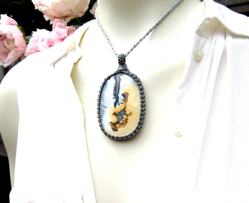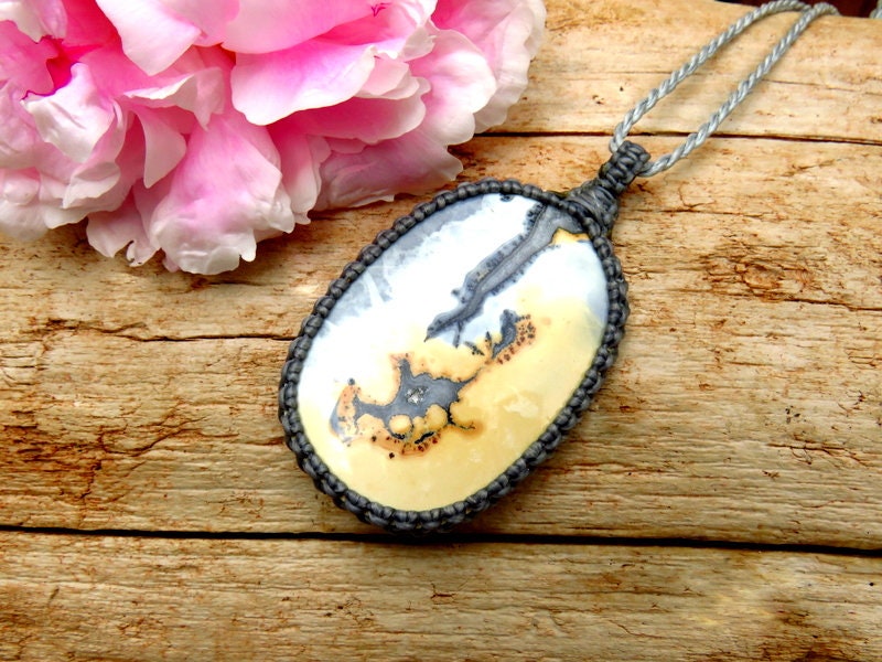 A very unique beauty ! Maligano Jasper gemstone necklace ! Maligano Jasper from Sulawesi Island, Indonesia. Contains magnificent patterns - soothing gray and yellow - this one is particularly special with its intriguing shapes ✨
