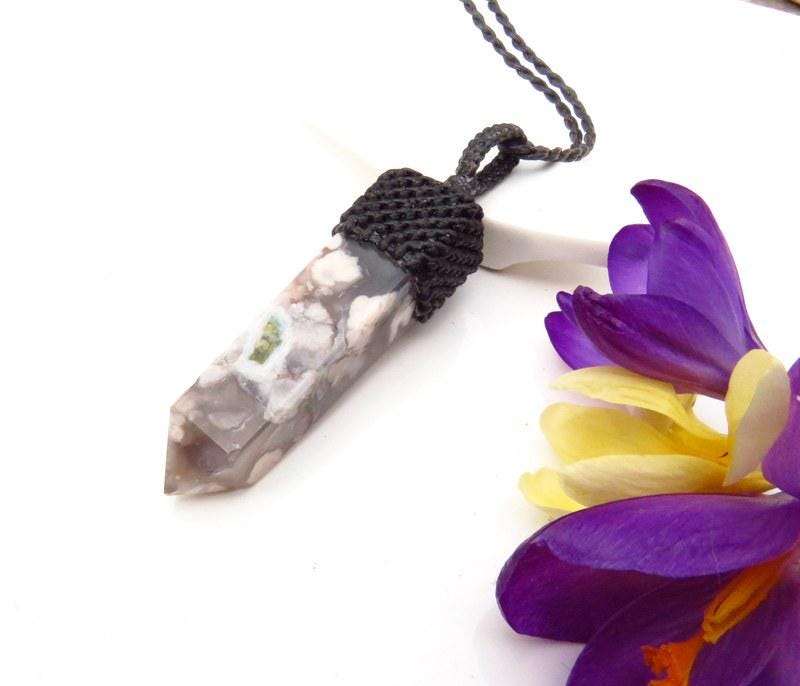 Materials: agate, gemstones, stones, semiprecious stones, flower agate, waxed cord.