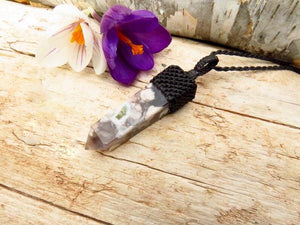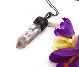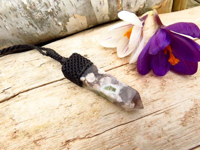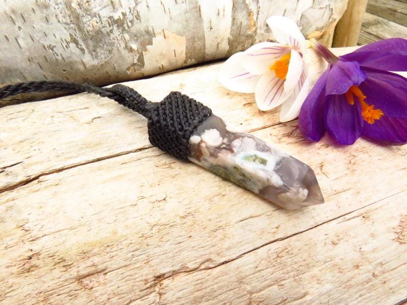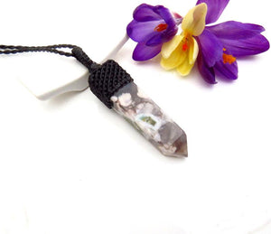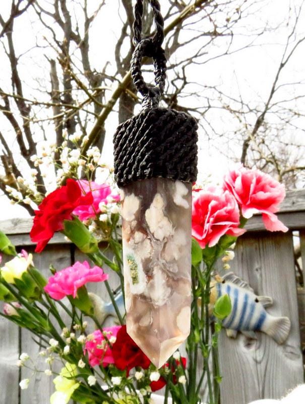 Gorgeous Black Flower Agate macramé necklace ! From Madagascar - Its gorgeous plumes resemble cherry blossoms✨ The contrast of dark gray & black with the pinkish gray plumes is simply gorgeous! Also called "Snowflake Agate."
