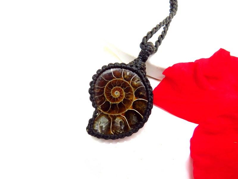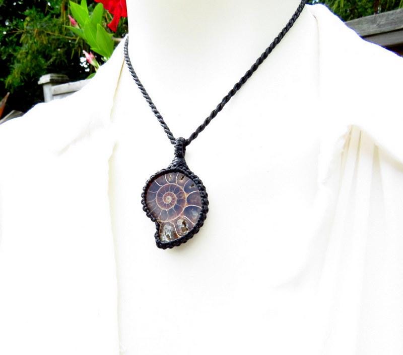 Beautiful Ammonite necklace - So fun to gaze at the spiral rays and imagine sea life 400 million years ago. The Ammonite macrame necklace is a stunning marriage of history and artistry. This unique piece features an Ammonite fossil, intricately woven into a macrame setting. This Ammonite necklace is like wearing a piece of our ocean's history that has been ✨macrame-magically✨ transformed into a conversation piece! A testament to the beauty of the past adorning the present.💗 In addition, the backside of this piece has a gorgeous green flash!