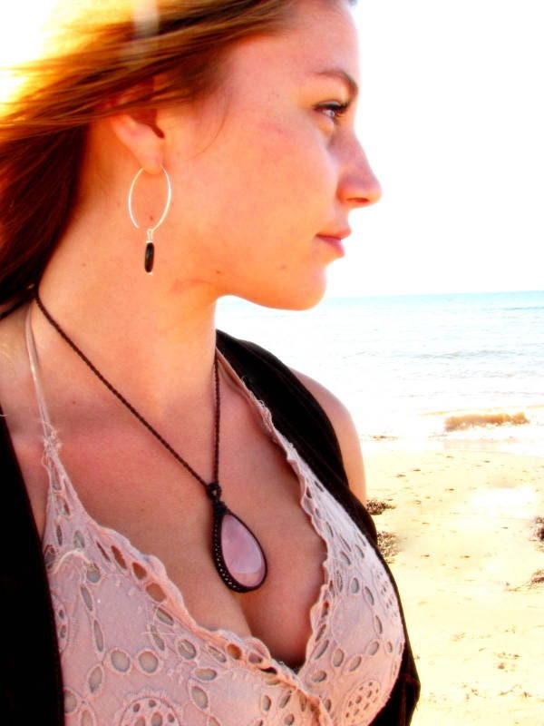 Materials: rose quartz, crystal, cabochon, waxed cord.