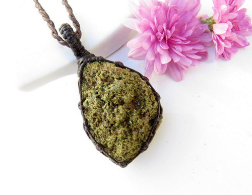 Green Epidote crystal macrame necklace - Epidote is found in a variety of colors with the green variety being called 'Pistacite' - This Epidote is covered in dark green twinkling crystals - there is far more twinkle than our camera could capture ! *Backside has has been coated for stability.