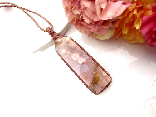 Gorgeous 🌺 Flower Agate 🌺 macramé necklace ! From Madagascar - Its gorgeous plumes resemble sweet cherry blossoms✨ The soft pink and gray colors are a GORGEOUS combination 😍 Also called "Snowflake Agate."