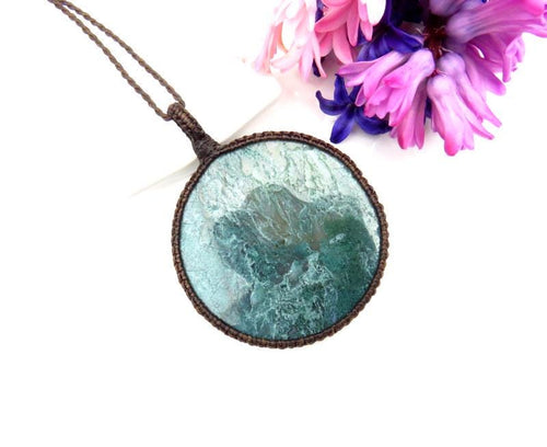 *This Moss Agate pendant is 7.6 cm long (excluding the loop) and 7.6 cm wide