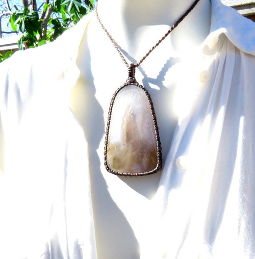 We are calling this one "The Volcano" - This listing is for a beautiful Plume Agate macrame necklace - this gorgeous gemstone has delicate and intriguing plumes that resemble an exploding volcano - can you see it ?