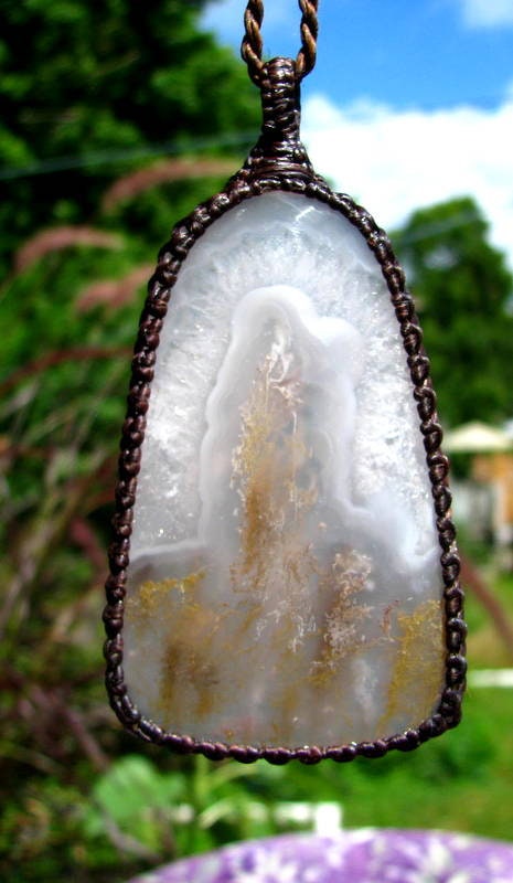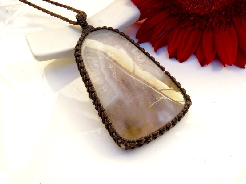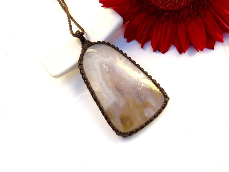 We are calling this one "The Volcano" - This listing is for a beautiful Plume Agate macrame necklace - this gorgeous gemstone has delicate and intriguing plumes that resemble an exploding volcano - can you see it ?