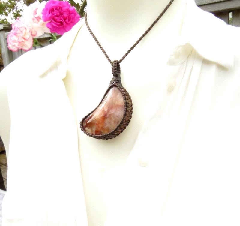 == The macramé design covers the perimeter of the stone - we do not cover the back so the stone can touch or sit close to the skin