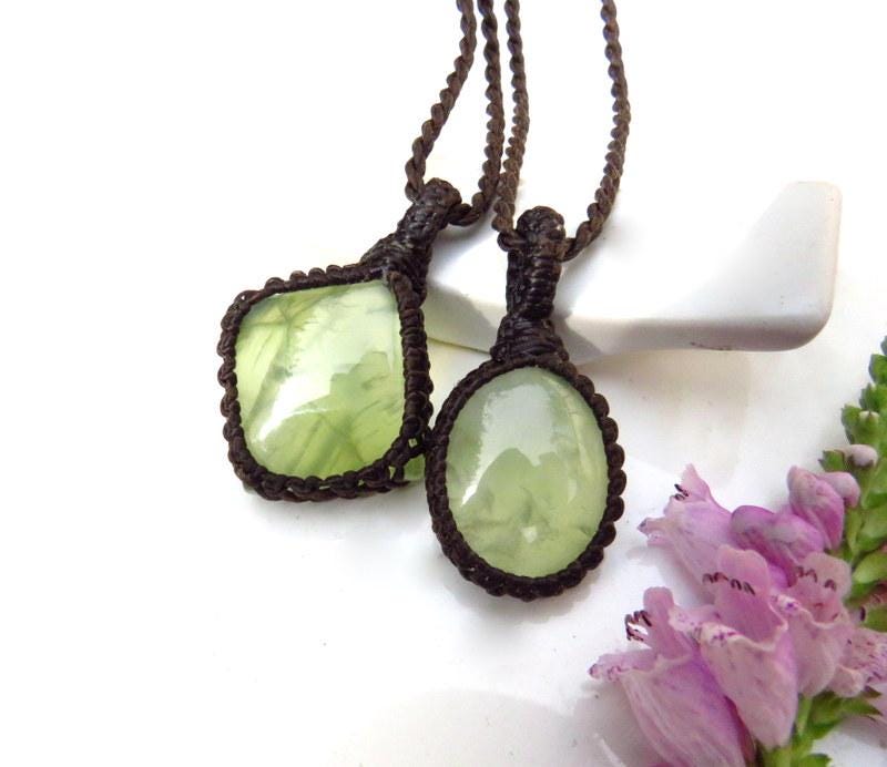 💚INNER KNOWING, DREAMING & REMEMBERING 💚This listing if for TWO super juicy Prehnite macrame necklaces ! Quality Prehnite macrame necklaces - dreamy, soft, translucent lime green - These pairs can be worn as a stacked necklace set or worn separately - also a lovely idea for best friends and soul-mates - also a great size for kids! *You will receive BOTH (2) pieces with the cord length of your choosing for each (if you wish for different lengths, please indicate in the 'notes to seller' box in your cart or send us a message! )