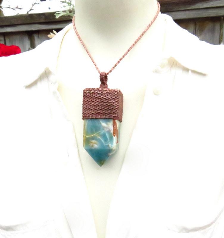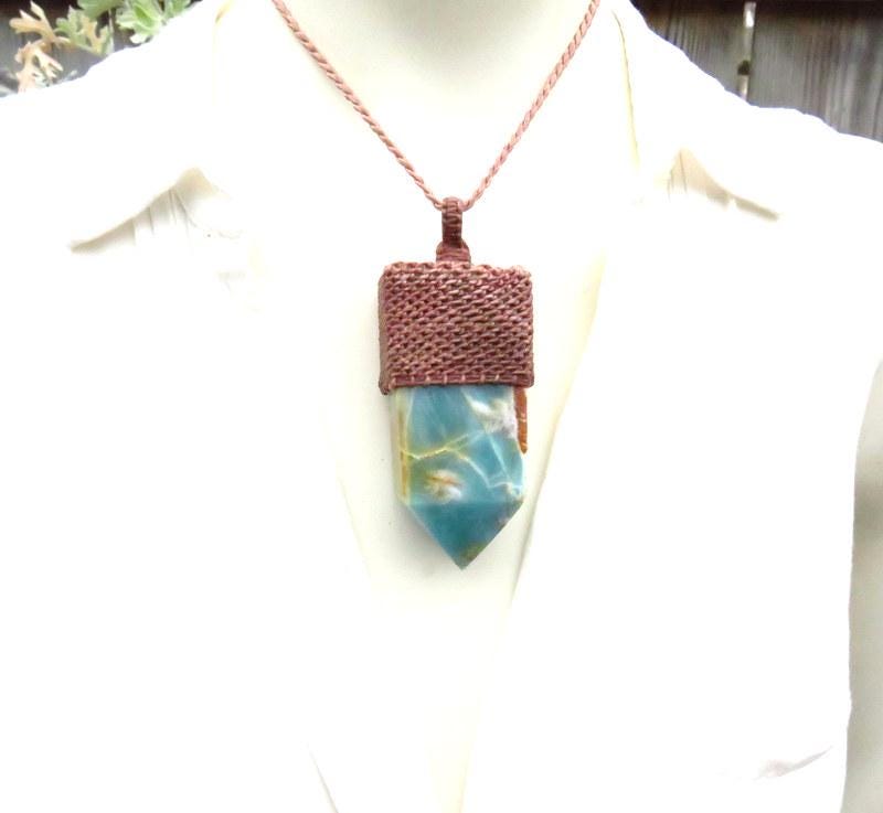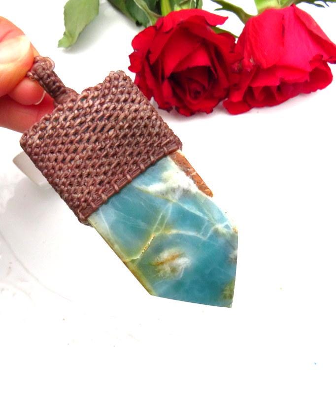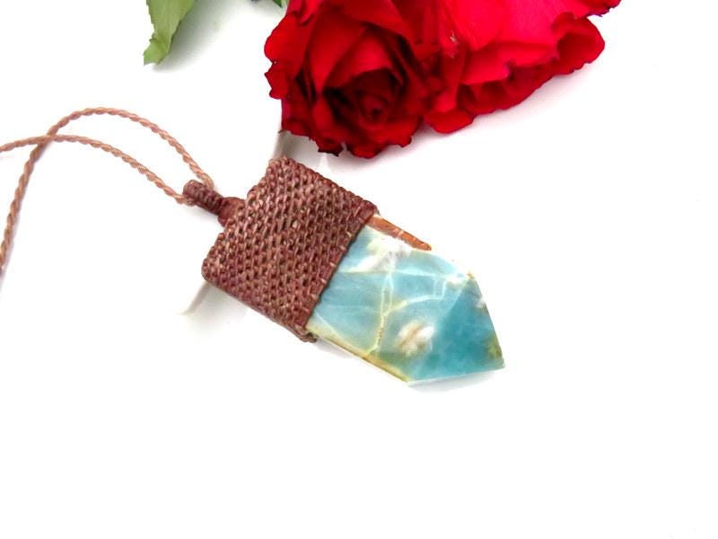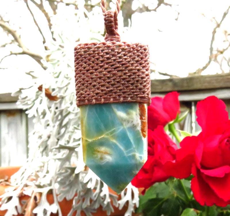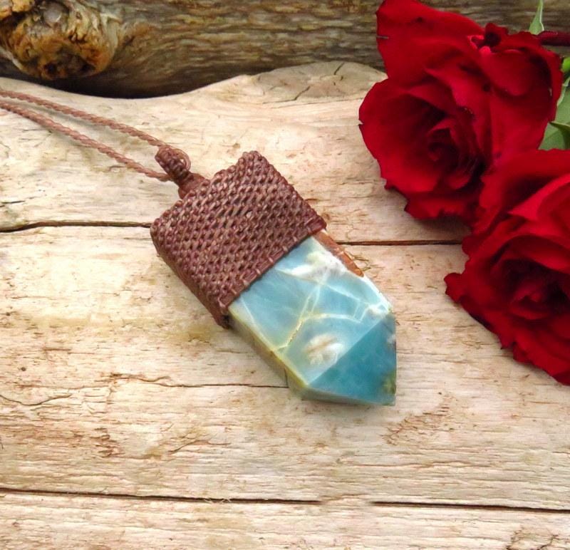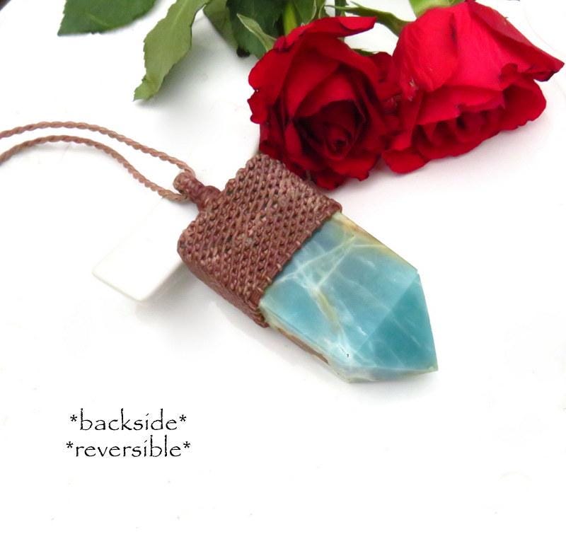 Beautiful Caribbean Calcite crystal point macrame necklace - WOW 😍 A must have for the collector's treasure box! A gorgeous blue Calcite (resembles the color of Larimar) with gorgeous patterns. This crystal point can be worn showing either side - reversible !