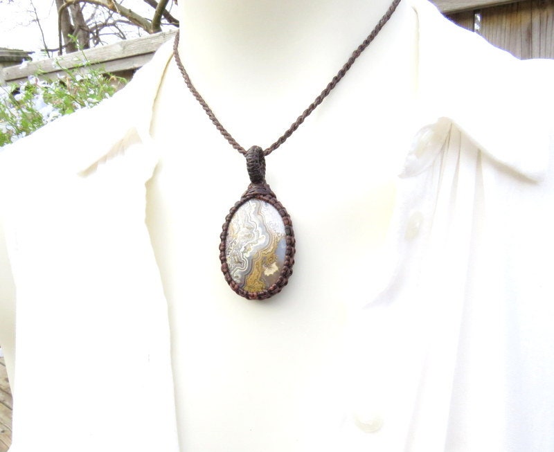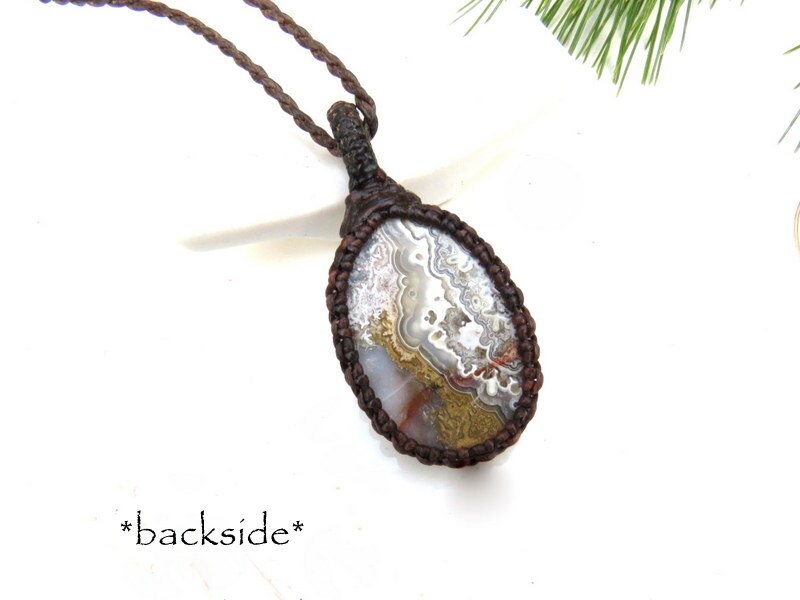 Materials: agate, semiprecious stones, crazy lace agate, mexican lace agate, waxed cord, gemstone.