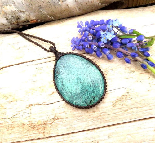 Beautiful Cloud Mountain Turquoise macrame necklace - beautiful color and web patterns ! Cloud Mountain Turquoise comes from a mine in the Hubei Province in central China that has been the most prolific Turquoise mine in Asia!