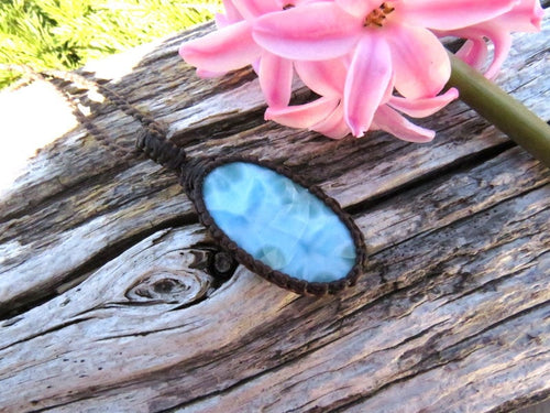 Spectacular💙🌊 Superb quality Larimar macrame necklace - Also known as the 'Dolphin Stone' - the prettiest caribbean blue with its distinctive honeycomb pattern that resembles rippling waves - unique shape and a generous size. You will receive the exact stone in photos #1-7 and the video. Backside is unpolished but smooth. In addition to its alluring colour, Larimar is a also a powerful and energetic stone! Only found in the Dominican Republic and mined only by hand - in a very difficult area to access- Larimar is considered to be among the rarest gemstones in the world. Psychic Edgar Cayce (1877 - 1945). predicted that on one of the Caribbean islands a blue stone would be found with extraordinary healing attributes and it is believed that Larimar is the stone that Cayce was speaking of.