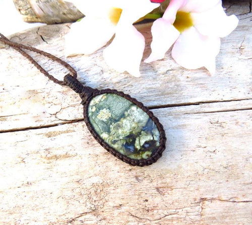 Sweet Rainforest Jasper macrame necklace - So many shades of green ! Earthy and unique! Also known as Green Rhyolite, Rainforest jasper was created from a molten flow of magma from the now extinct Mount Hay volcano near Queensland, Australia (about 120 million years ago!)