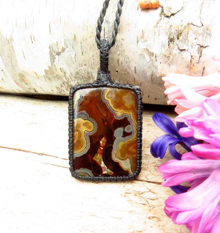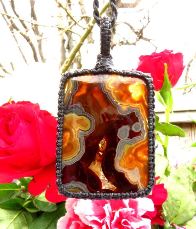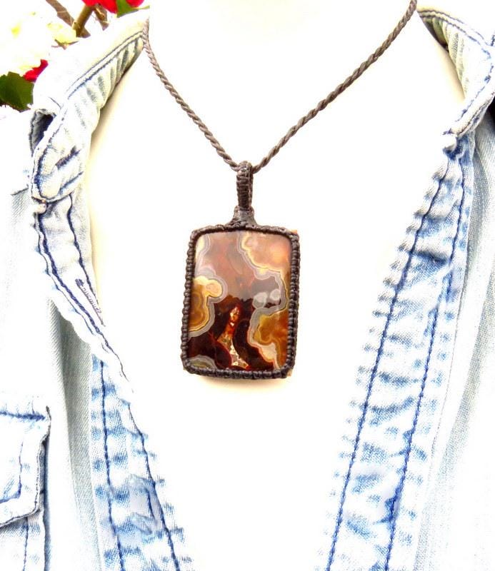 Materials: agate, gemstones, semiprecious stones, waxed cord, pseudomorph agate.