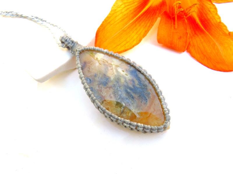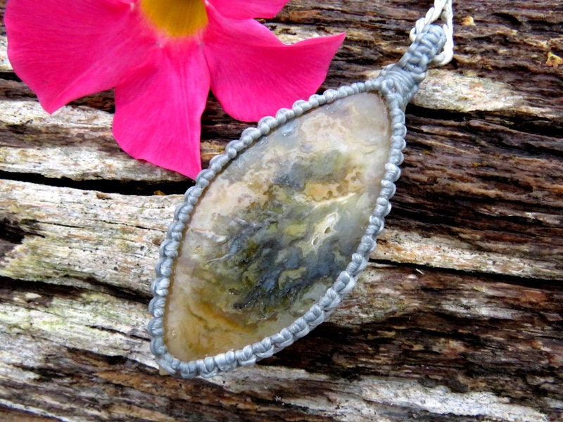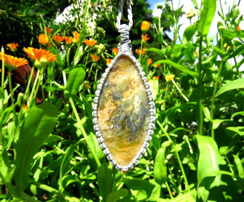 Spectacular Graveyard Point Plume Agate macrame necklace- this is a top shelf RARE Graveyard Plume FULL of gorgeous, billowy plumes suspended in Agate. This is a professionally sourced and cut designer gemstone ! From Oregon USA. *All of our Healing Stones include a description of their healing properties ✨