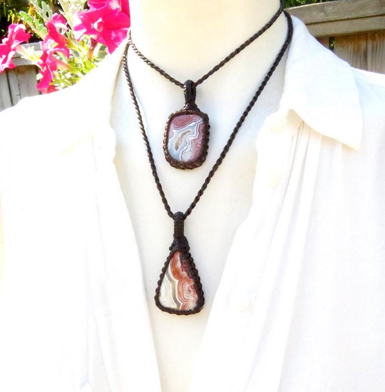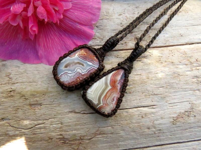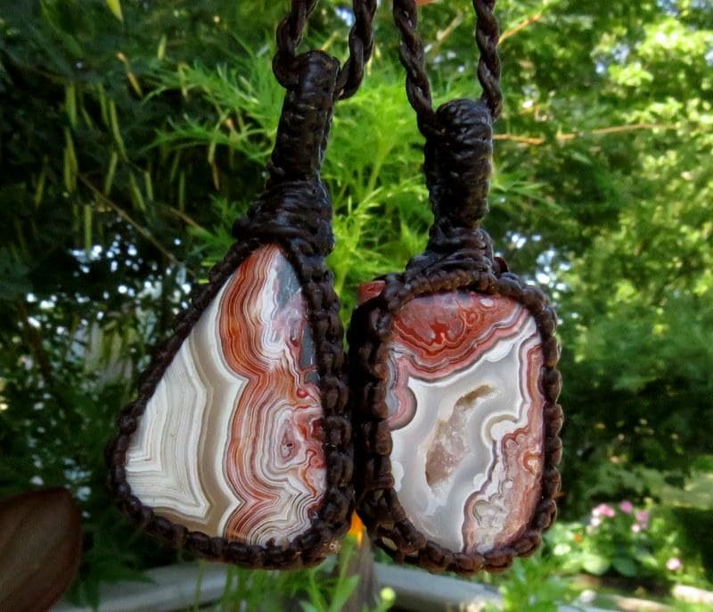 Beautiful Crazy Lace Agate macrame necklace - also known as Mexican Crazy lace or the 'Happy Stone'- Mesmerizing, red and gray banding and one piece has beautiful druzy. This listing is for TWO Crazy Lace Agate necklaces - the perfect idea for best friends or soulmates to share or wear them together layered or they can be worn separately!