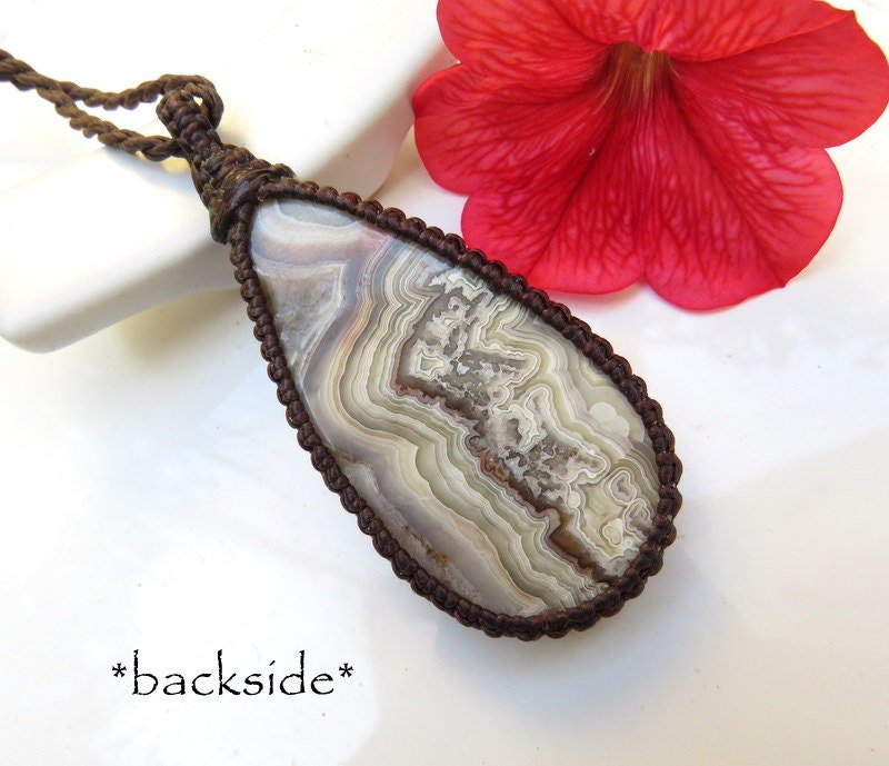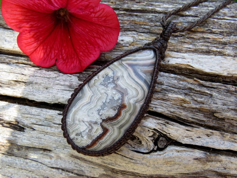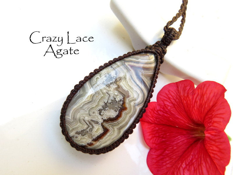 Materials: agate, semiprecious stones, crazy lace agate, mexican lace agate, waxed cord, gemstone.