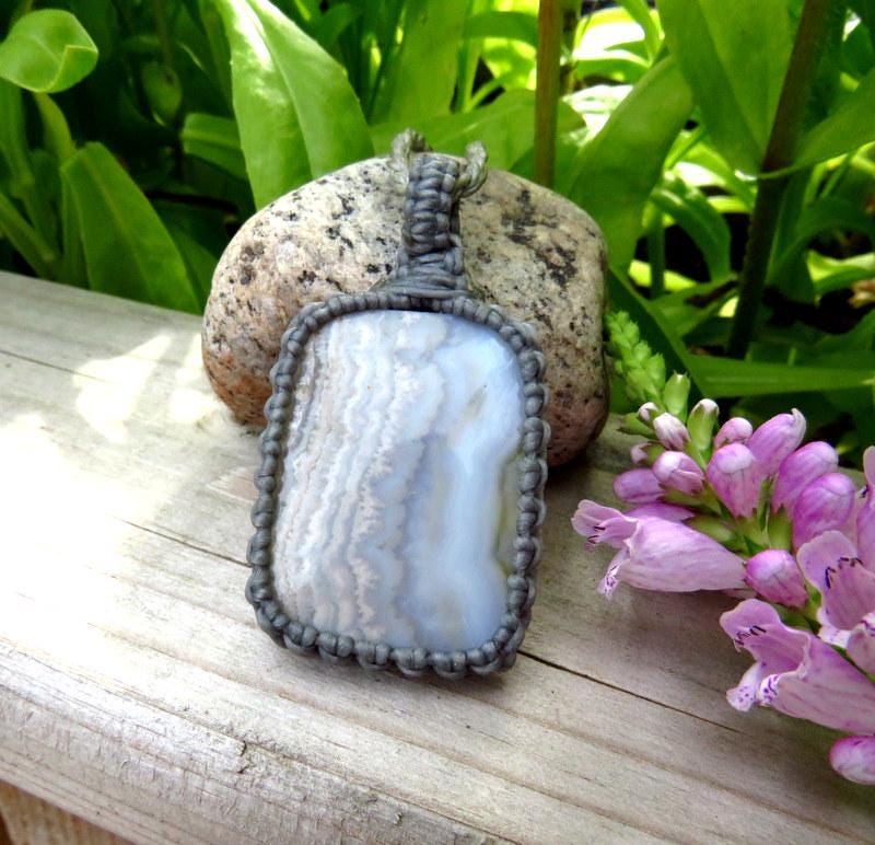 Unique and beautiful gray banded Agate macrame necklace - soothing gray in color with the pretiest banding and patterns. Wrapped in our silver-gray cord !