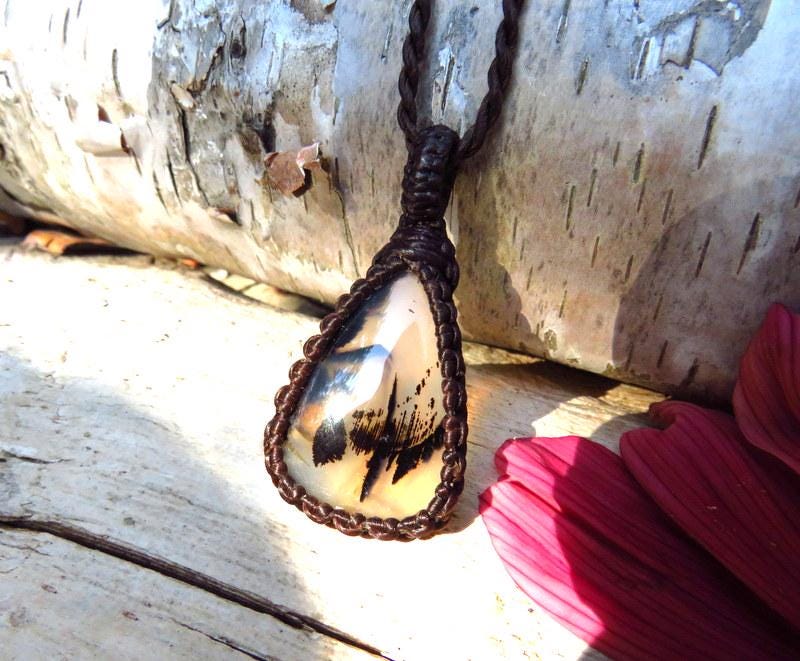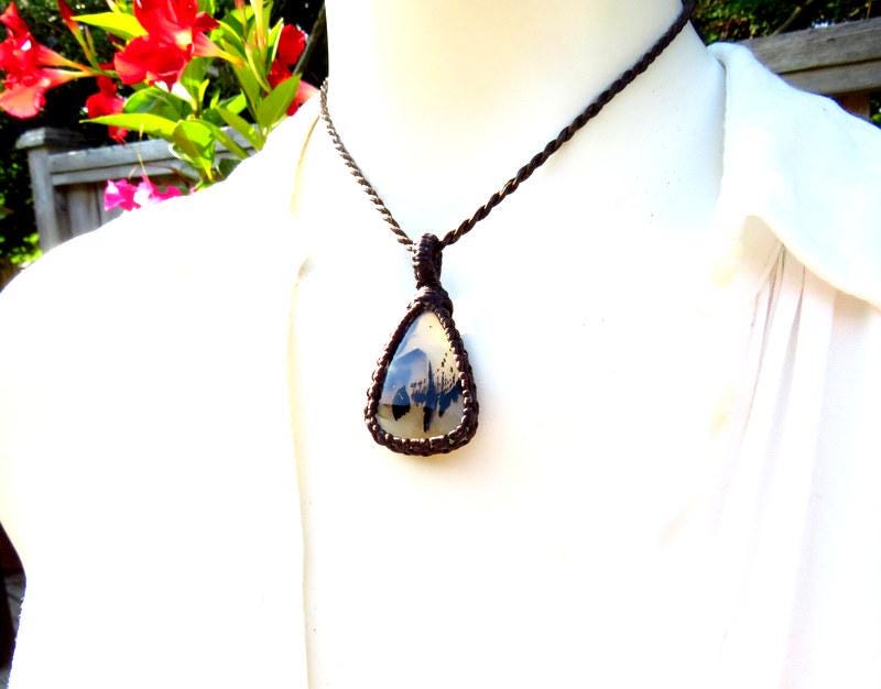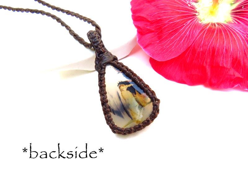 Gorgeous Montana Agate macrame necklace - This remarkable Agate is found in the Yellowstone river region in Montana, USA . This scenic Agate is known for its beautiful dendrite formations that make the most beautiful scenes. This piece has lovely 'paintbrush strokes' - one of a kind !
