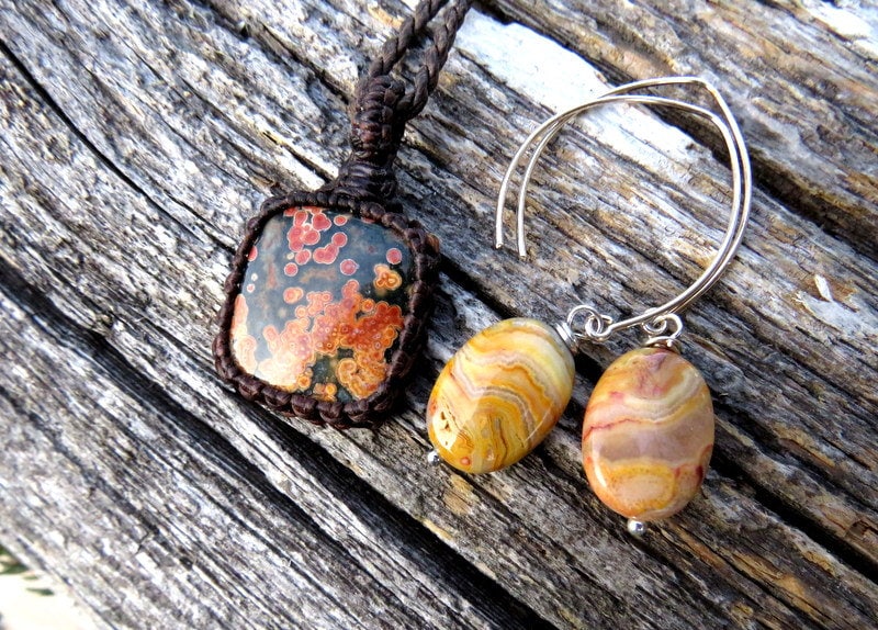 Unique Ocean Jasper necklace and Crazy Lace sterling silver earrings set ! Here we have a sweet Ocean Jasper macrame necklace - orange and green and dotted with wonderful orbs. The Crazy Lace Agate earrings are made of sterling silver and yellow and orange Crazy lace Agate with pretty banding. We love this jewelry set ! The perfect anniversary gift or for Valentines Day !