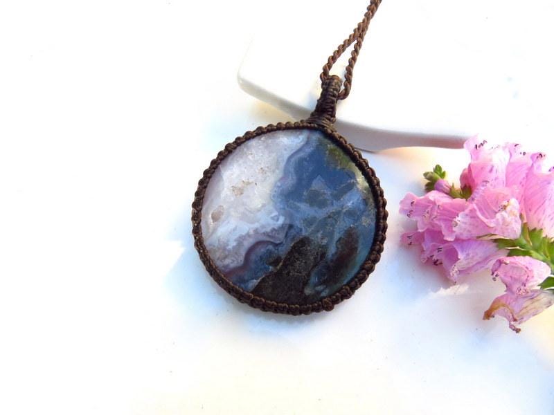 Materials: agate, moss agate, cabochon, waxed cord, gemstone.