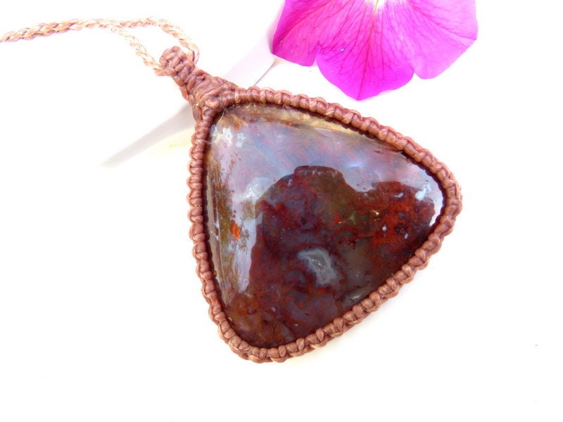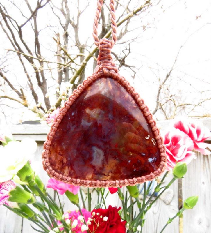 Deep red Plume Agate macrame necklace - Plume Agate contains branching mineral inclusions and patterns that resemble feather - like plumes, moss, little trees or other vegetation. A great gift for the gardener or nature lover 🌳 🌿