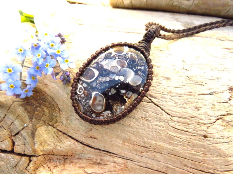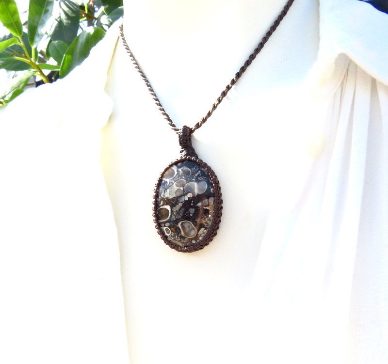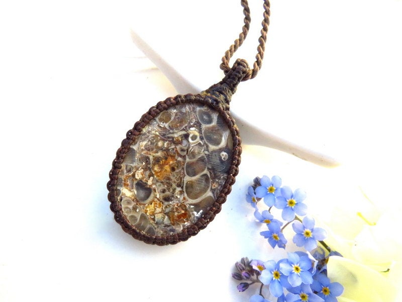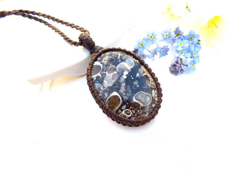 Materials: agate, waxed cord, fossil, torritella fossil, turtle agate, semiprecious stones.