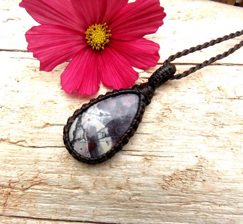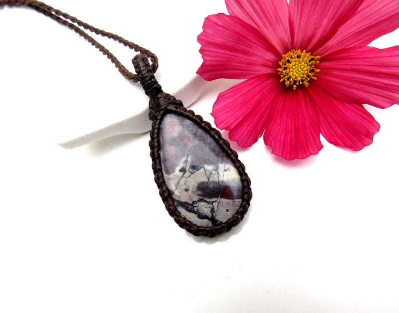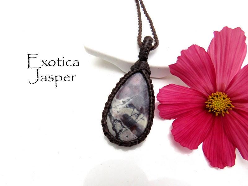 🌹So pretty ! Exotica Jasper Macrame Necklace - also known as 'Sci -fi Jasper.' A breathtaking gemstone that embodies the beauty of nature’s palette. With its rich, earthy tones and intricate patterns, it resembles a vivid landscape painted by an artist's brush. The stone showcases a mesmerizing mix of deep purple, grays and brown - swirling together in unique formations that tell a story of their own.