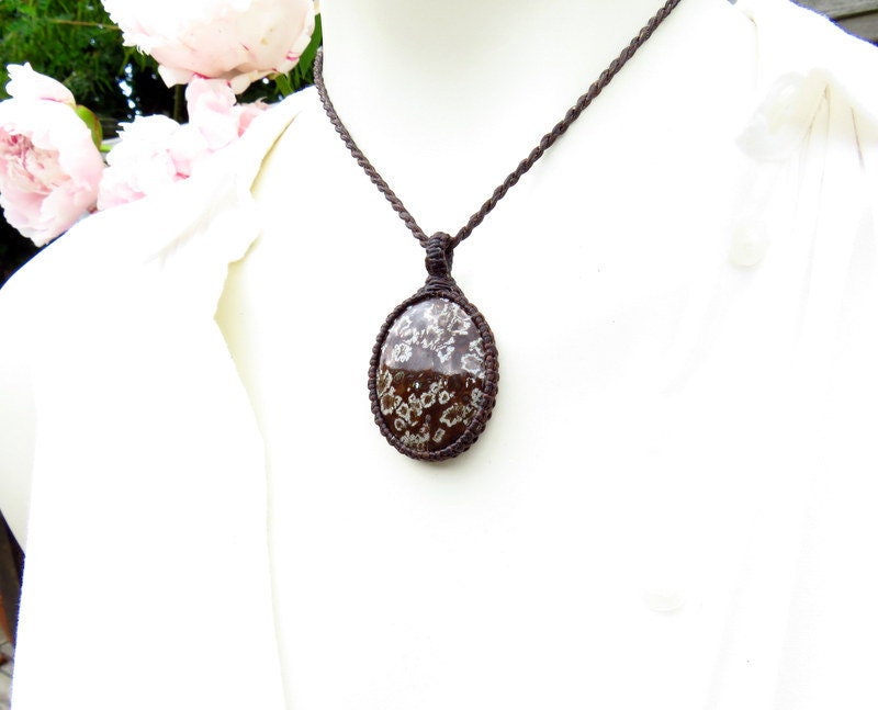 Brown Snowflake Obsidian macrame necklace - Unique brown Snowflake Obsidian - the snowflake patterns are the inclusion of the mineral Cristobalite. Cool find !