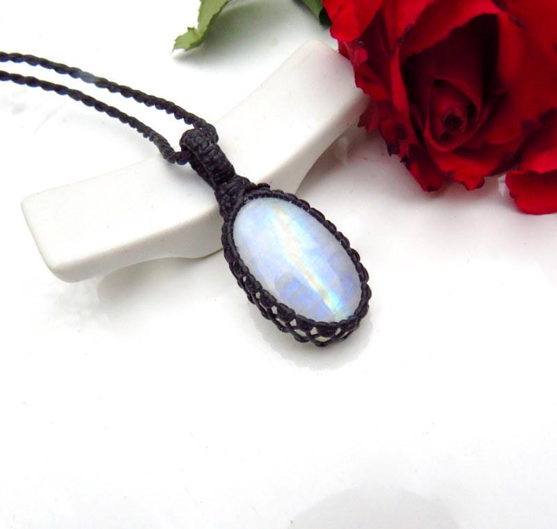 Materials: moonstone, cabochon, waxed cord, crystal, gemstone, blue moonstone.