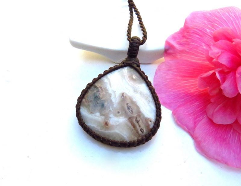 Lovely Ocean Jasper macrame necklace - soothing gray, green and tan with beautiful patterns ! This is a very unique gemstone found only at low tide and by boat - at a remote location on the coast of Madagascar . As there is a lot of mysticism surrounding Ocean Jasper and is a favorite among mineral collectors - it is a highly sought after gemstone. This Ocean Jasper pendant evokes a smile and thoughts of our mysterious ocean - Ocean energy surrounds.