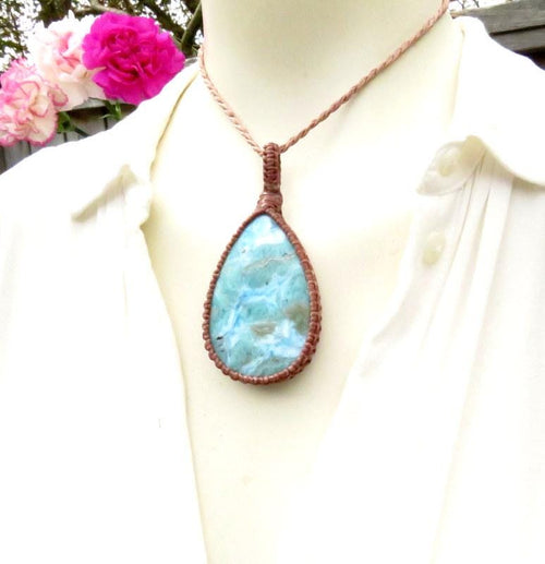 Larimar Macrame Pendant Necklace: Caribbean Blue Gemstone, Boho Summer Jewelry
