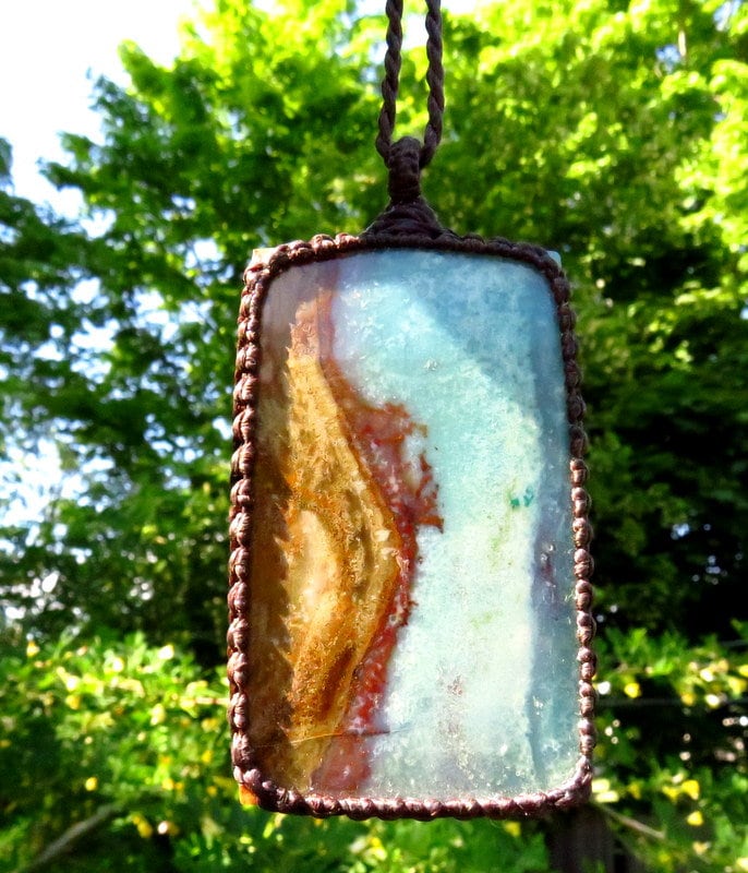 are and beautiful Blue Opalized Petrified Wood gemstone necklace! Petrified Wood with Blue Opal was first found as pebbles and larger rounded stones (“cobbles”) in streams and near the slopes of three volcanoes in Indonesia’s West Java Province. What the miners actually found was an ancient petrified forest (how cool is that?), which had been pushed over by a volcanic explosion. Then, over the ages, the wood was fossilized and preserved by opaline silica. A wonderful addition to the rock collector's collection!