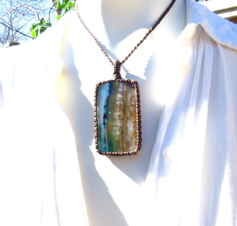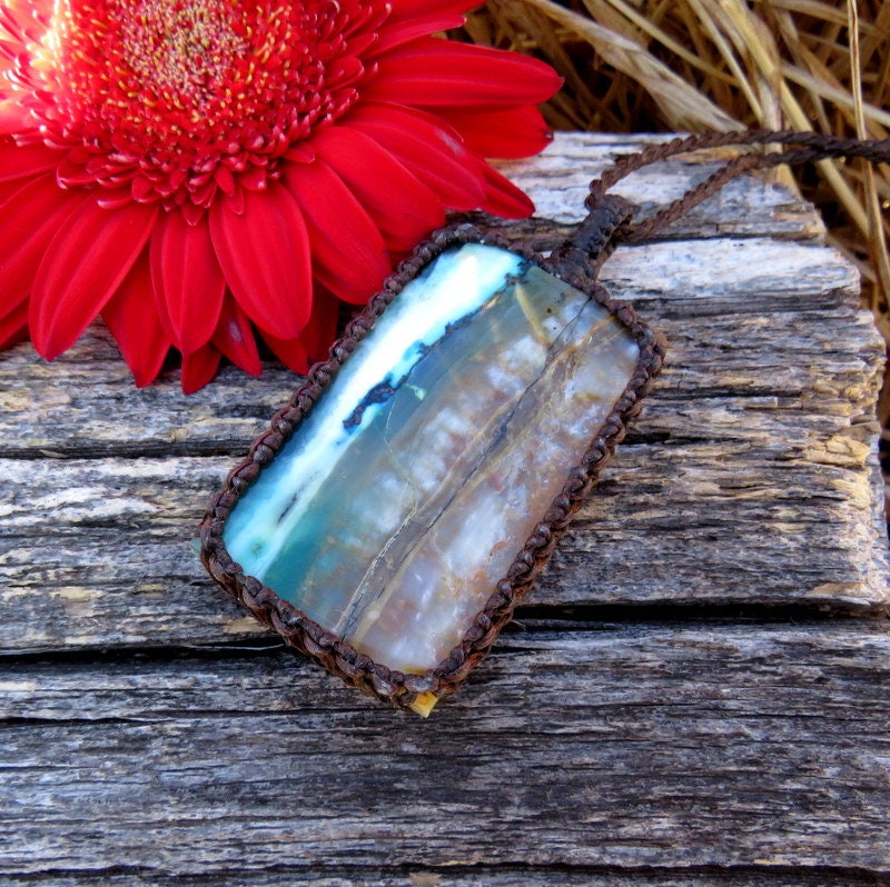 INCREDIBLE ! Blue Opalized Petrified Wood macrame necklace ! Petrified Wood with Blue Opal was first found in streams near the slopes of three volcanoes in Indonesia’s West Java Province. Local miners found an ancient petrified forest - which had been pushed over by volcanic flows. The wood in this ancient forest was fossilized and preserved by opaline silica. This is "Blue Opalized Petrified Wood!" Quality pieces of this material are difficult to come by now making this a very special find !