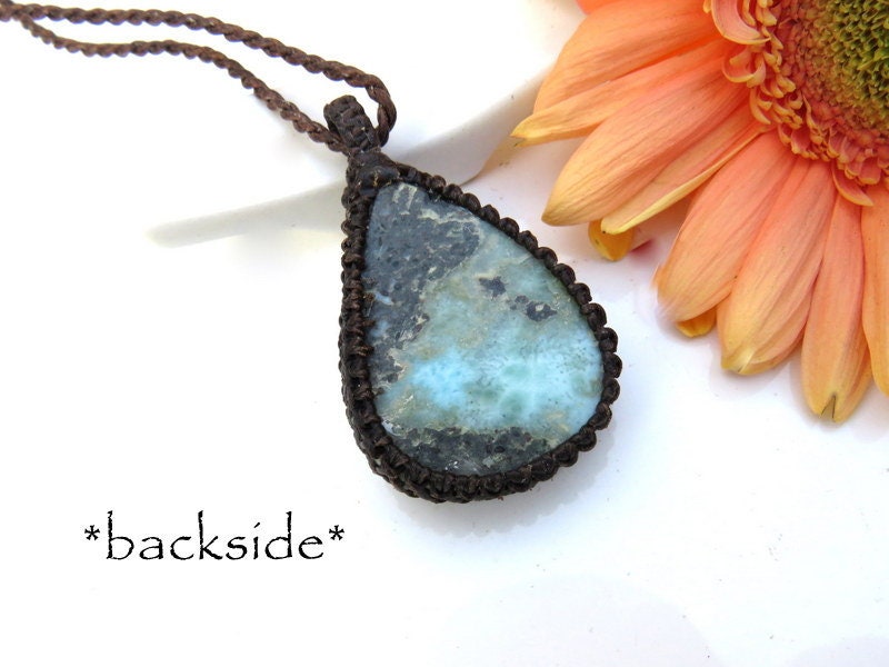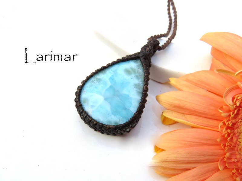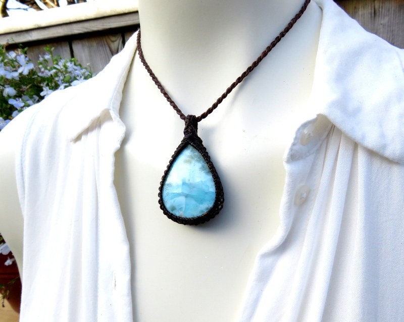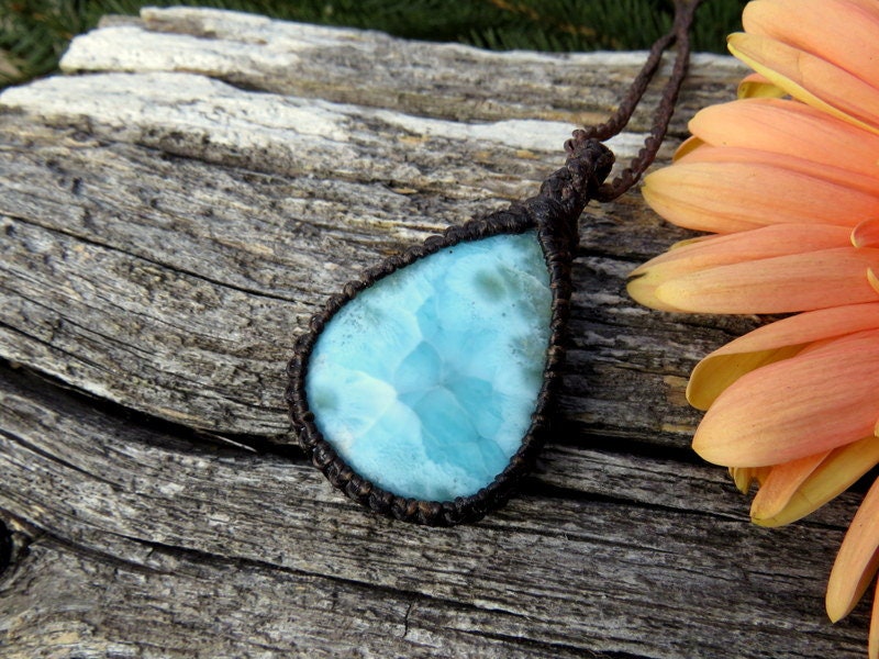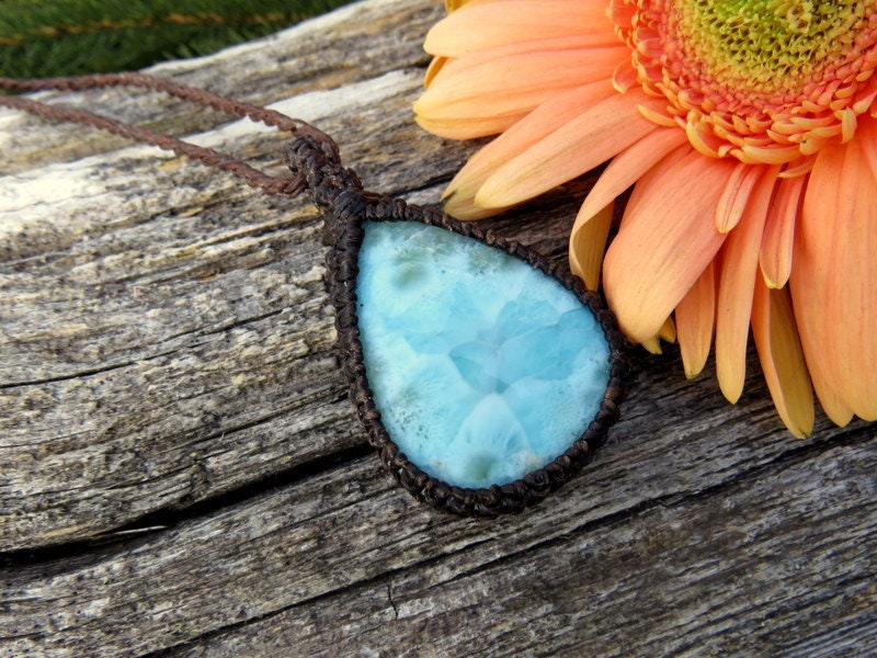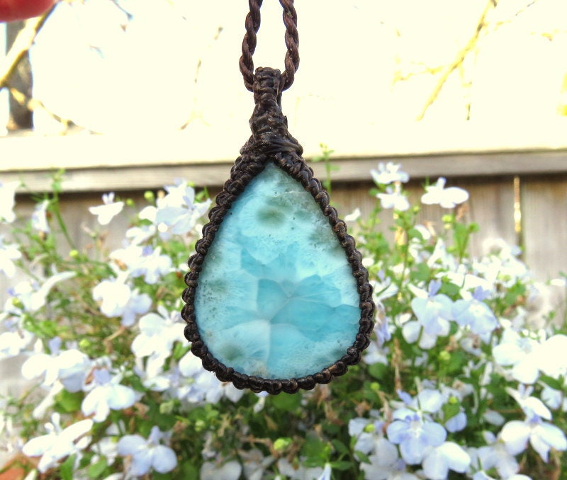 Spectacular💙🌊 Top quality Larimar macrame necklace - Also known as the 'Dolphin Stone' - the prettiest caribbean blue with its distinctive honeycomb pattern that resembles rippling waves - classic teardrop shape. You will receive the exact stone in photos #2-8. Backside is unpolished but smooth. In addition to its alluring colour, Larimar is a also a powerful and energetic stone! Only found in the Dominican Republic and mined only by hand - in a very difficult area to access- Larimar is considered to be among the rarest gemstones in the world. Psychic Edgar Cayce (1877 - 1945). predicted that on one of the Caribbean islands a blue stone would be found with extraordinary healing attributes and it is believed that Larimar is the stone that Cayce was speaking of.