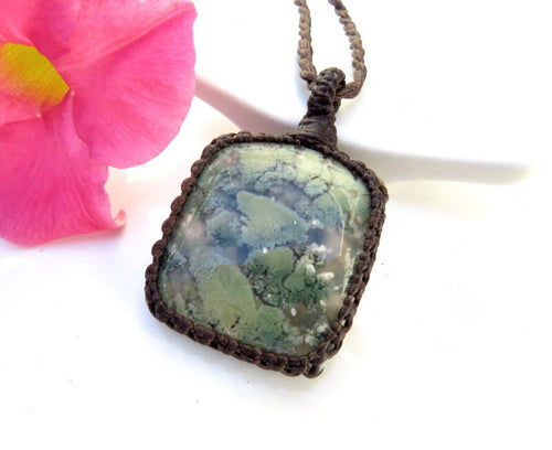 Spectacular and one of a kind ! Green Moss Agate macrame necklace - Moss Agate contains branching mineral inclusions and patterns that resemble moss, little trees or other vegetation...This Moss Agate has and abundance of fluffy earthy green plumes suspended in translucent Agate 🌿🌿🌿 ~ A great gift for the gardener or nature lover ~ : )