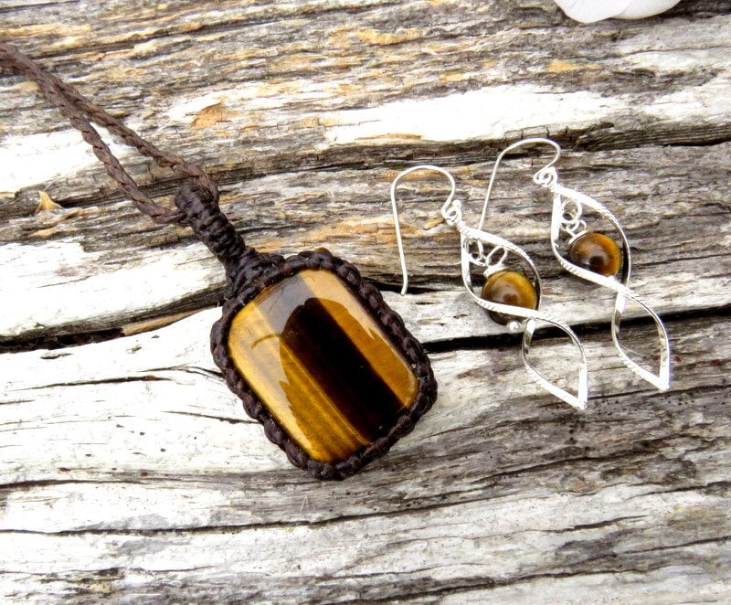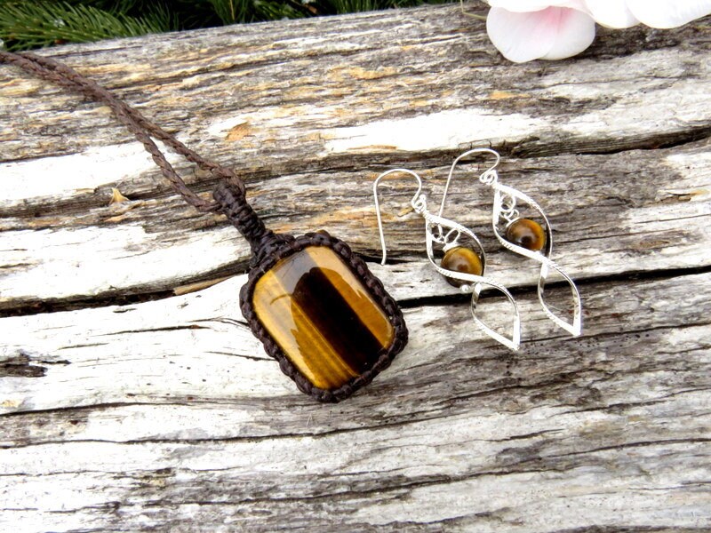 Tiger Eye macrame necklace and earring set, jewelry set