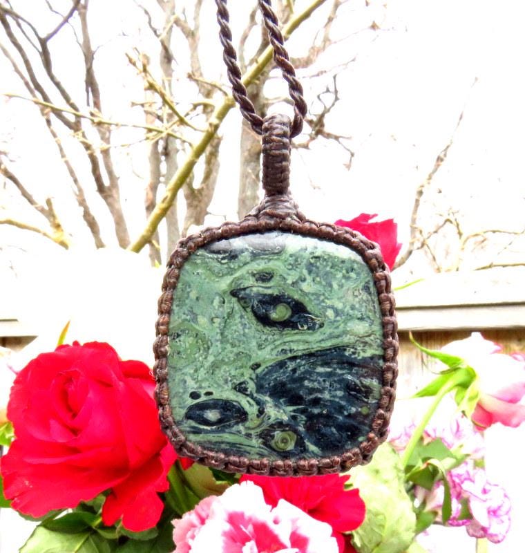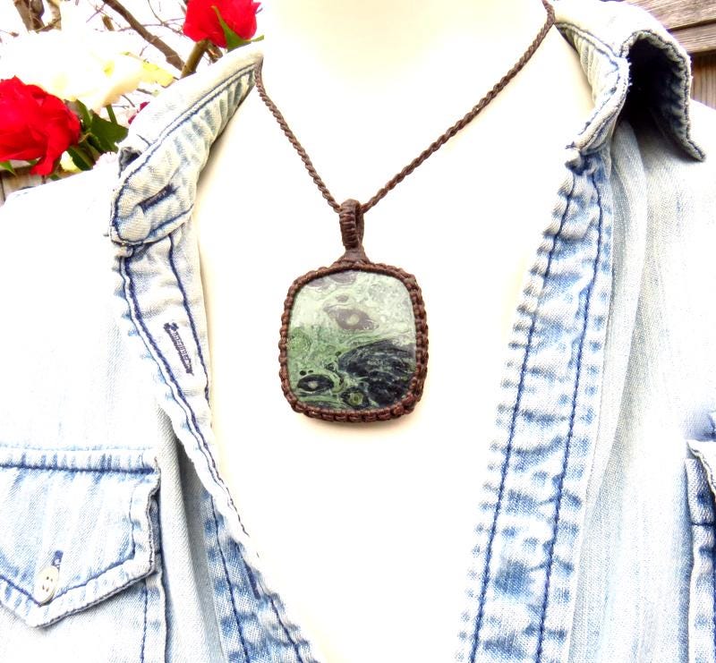 Unique Kambaba Jasper Necklace - Gorgeous green Jasper with captivating 'eyes' or resemble little galaxies - our remarkable Mother Nature ! Also known as 'Stromatolite' - this stone contains some the oldest fossils ever found on earth. The interesting formations are fossilized blue-green algae - the once dominant life form on the planet and it is believed that this algae is responsible for the formation of the earth's oxygen atmosphere ! *minor, natural imperfections