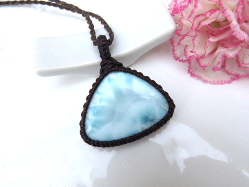 PEACE, LOVE & SERENITY 💎✨Perfection✨ Beautiful Larimar macrame necklace - Also known as the 'Dolphin Stone' - the prettiest Caribbean blue with its distinctive honeycomb pattern that resembles rippling ocean waves - only found in the Dominican Republic and mined only by hand - in a very difficult area to access- Larimar is considered to be among the rarest gemstones in the world. Psychic Edgar Cayce (1877 - 1945). predicted that on one of the Caribbean islands a blue stone would be found with extraordinary healing attributes and it is believed that Larimar is the stone that Cayce was speaking of. ✨ You will receive the exact stone in photos #1-5