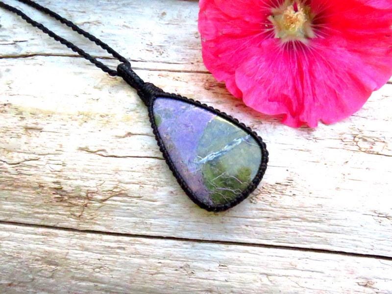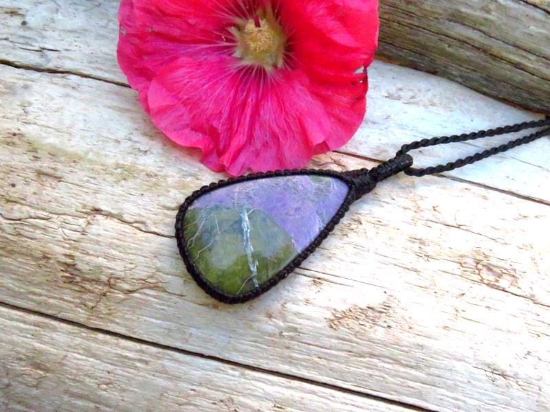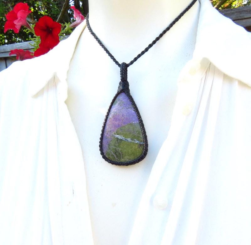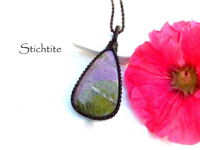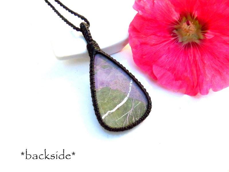 Gorgeous Atlantisite macramé necklace - beautiful combination of green Serpentine and Purple Stichtite ! Intriguing patterns on the frontside and the backside of the stone. This is a rare combination of minerals (and colors). Atlantisite is exclusively found in Zeehan, Tasmania. It is also sometimes called Tasmanite. Here it is found only on a small hilltop called Stichtite Hill. Great find!