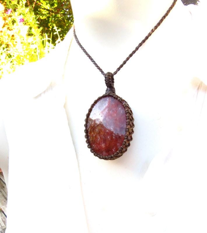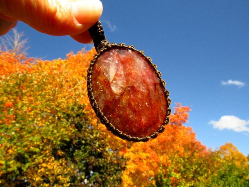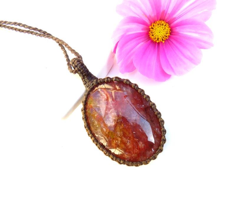 Spectacular earth bohemian Red Hematoid Quartz necklace - Red Hematoid Quartz is Quartz that contains Hematite - which gives the Quartz its rich, deep red colour. This Hematoid Quartz has contains dramatic, flashy layers that flash in the light and there are numerous rainbow prisms 🌈 Both the front and backside of the stone is beautiful (*reversible!) Such a treasure! Also referred to as : Red Fire Quartz