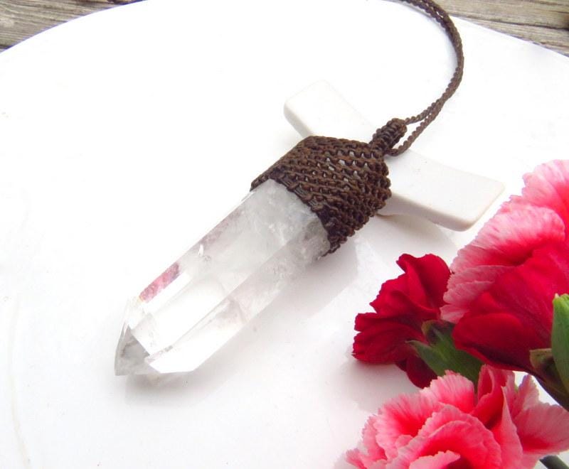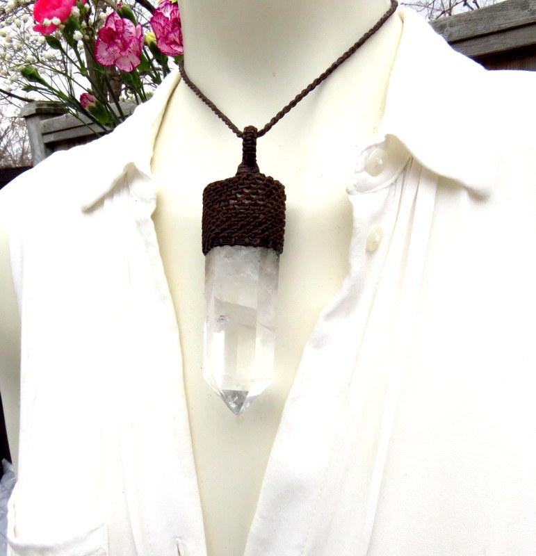 This listing is for a gorgeous Quartz crystal necklace - Like a cosmic icicle, it flaunts its six-sided symmetry, catching the light and throwing it back in a dazzling dance of clarity. This crystal maestro conducts a symphony of transparency, revealing the subtle dance of its inclusions as sunlight pirouettes through its facets. Unbelievable find ! ✨🌈