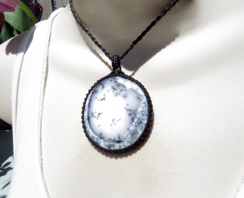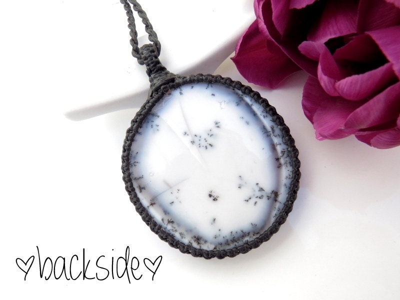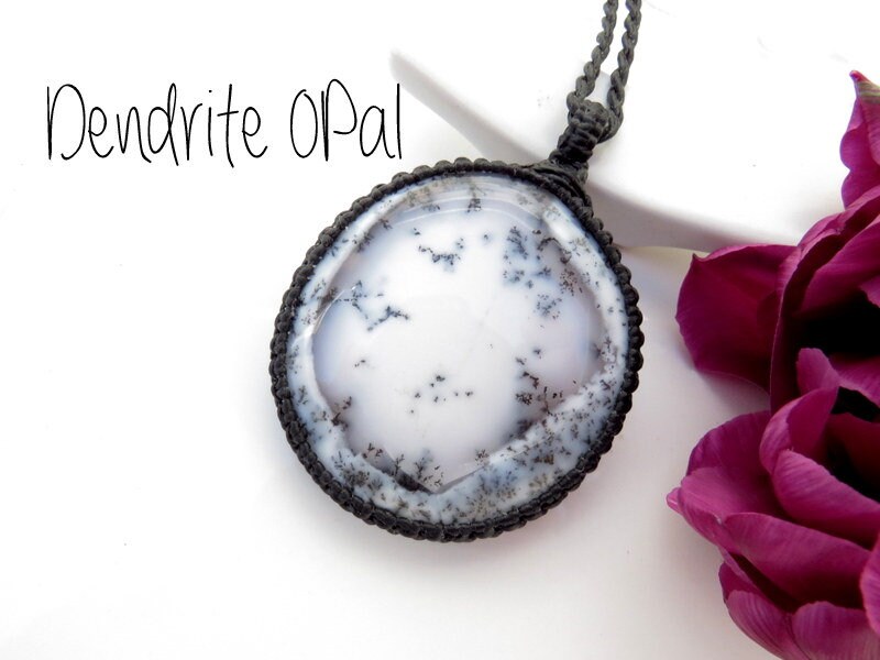 🌛SAID TO SUPPORT GROWTH & CHANGE🌜 Exquisite Dendrite Opal Macrame Necklace - crisp, black fern-like inclusions (dendrites) set against a gray and white semi-translucent background - perfect polish and classic oval shape. One of our best selling gemstones - This piece of dendrite opal, with its winter-y and mysterious landscape, is one of mother nature's masterpieces ! *You will receive the exact stone in photos #2-6 and the video (*model is wearing a different Dendrite Opal )