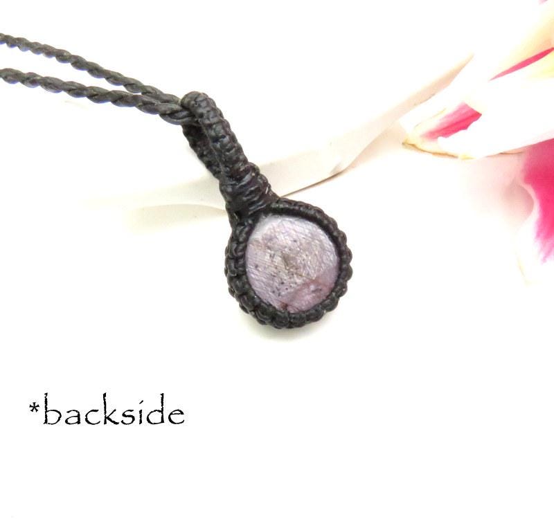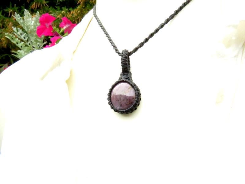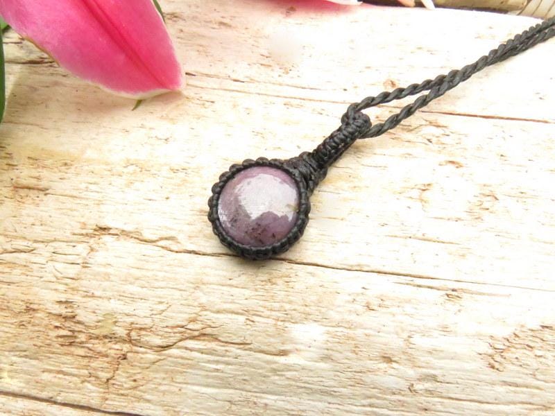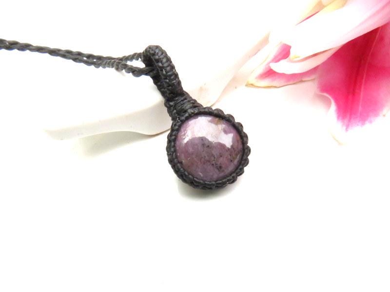Materials: ruby, cabochon, gemstone, semiprecious stone, waxed cord.