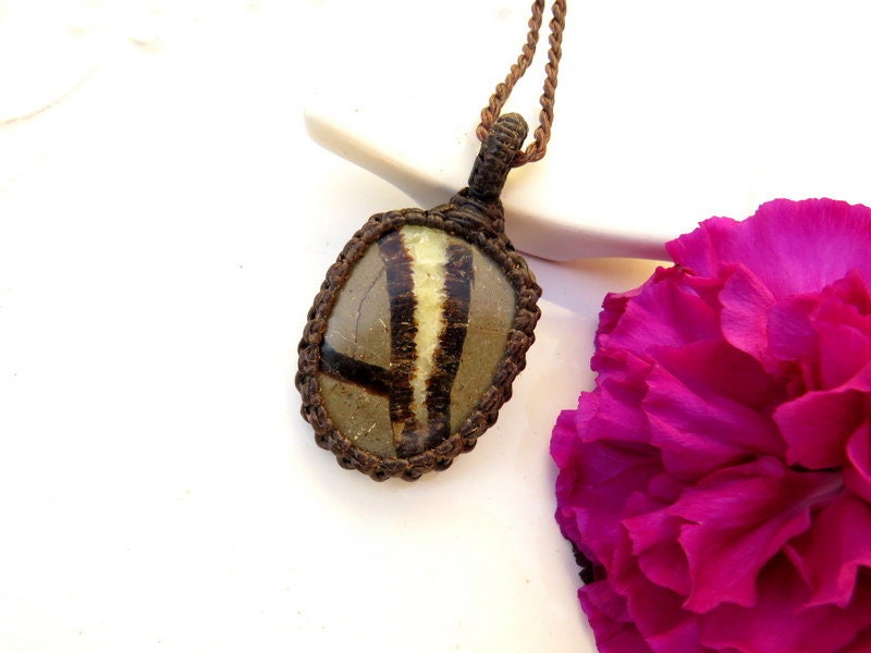 Unique Septarian macrame necklace - A great gift for the rock collector, the geologist or the rockound ! Septarian was formed during the Cretaceous Period or the years before dinosaurs became extinct (approximately 50 to 60 million years ago). It was discovered in the southern part of Utah and Madagascar, where sea levels at the time were so high that many parts of the Earth were submerged in water including volcanoes. Once the oceans returned to normal levels, the Septarian nodules were exposed. These formations had then dried and crystallized into aragonite and calcite crystals.