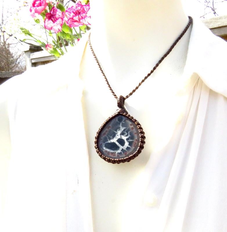 Materials: gemstones, waxed cord, semiprecious stones, septarian, geode.