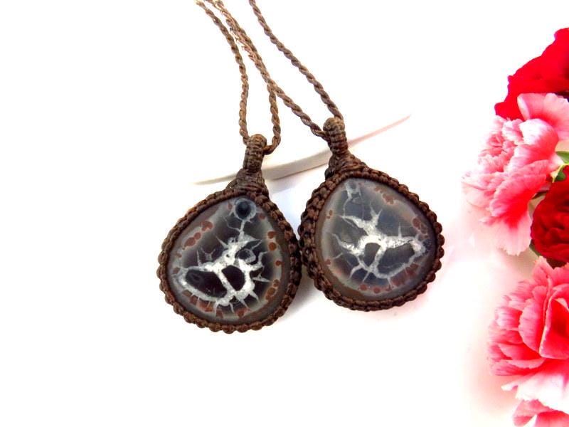 🌿LIFE IS ABOUT THE JOURNEY NOT THE DESTINATION🌿Fun and unique Septarian macrame necklace set - These intriguing pieces were formed 50 - 70 million years ago ! They contain cavities called ' septaria ' which are made up of ancient sea life and sediment. Also known as 'Dragon Stone .' This listing is for TWO earthy brown-black Septarians necklaces with an intriguing patterns and formations - these are identical Septarians from splitting the geode into two!