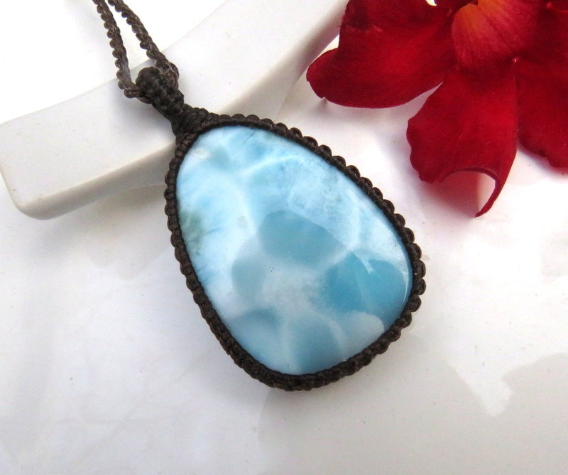Breathtaking, top quality, natural Larimar macrame necklace - Also known as the 'Dolphin Stone' - the prettiest Caribbean blue with its distinctive honeycomb pattern that resembles rippling ocean waves - only found in the Dominican Republic and mined only by hand - in a very difficult area to access- Larimar is considered to be among the rarest gemstones in the world. You will receive the exact piece in photos #2-7 and the video. (*model is wearing a different, larger Larimar to give you an idea of how our pieces look while wearing) Psychic Edgar Cayce (1877 - 1945). predicted that on one of the Caribbean islands a blue stone would be found with extraordinary healing attributes and it is believed that Larimar is the stone that Cayce was speaking of.