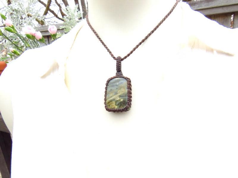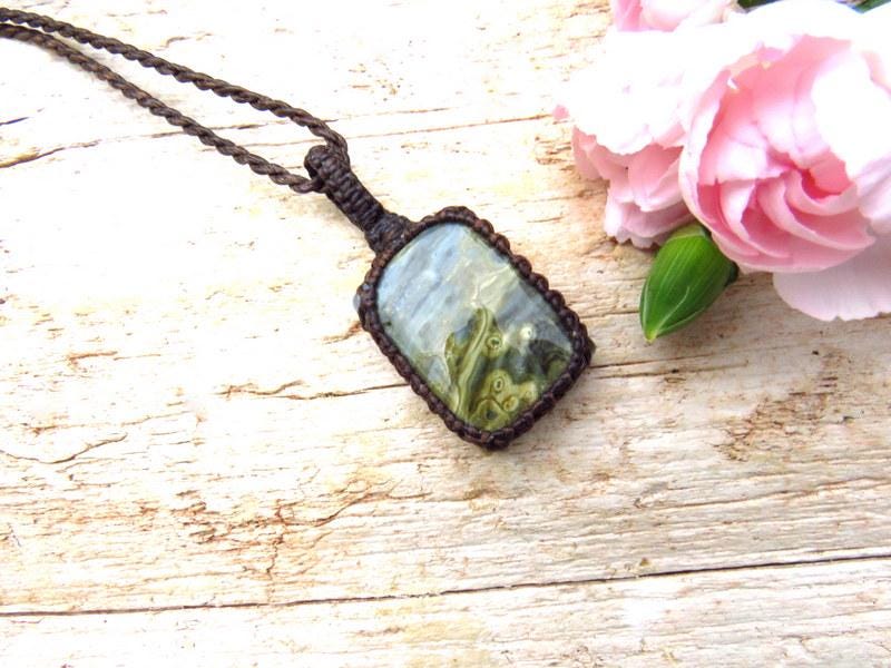 Unique Ocean Jasper macrame necklace ! Gorgeous green and yellow with fun orbs and intriguing patterns !